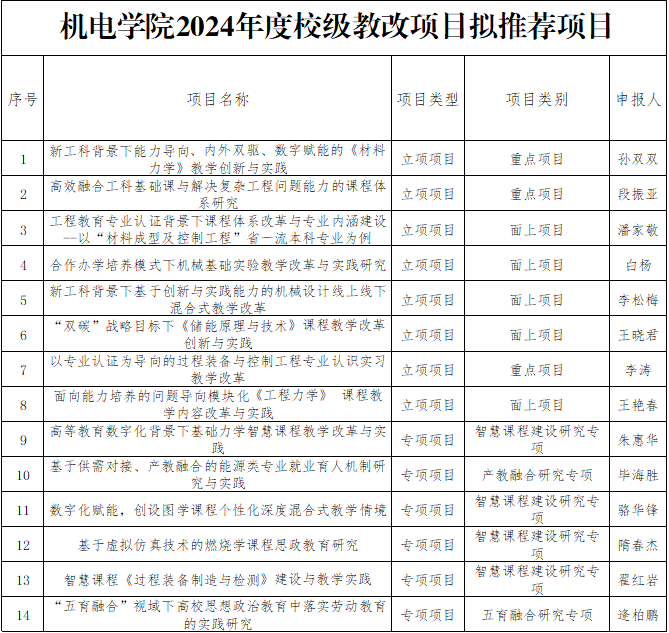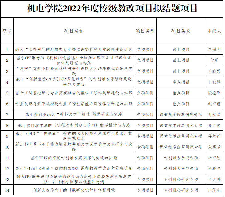 根据学校《关于开展2024年度校级本科教学改革研究项目和专项项目立项申报及2022年度项目结题工作的通知》要求,15vip太阳成集团组织了项目评审和结题验收,经项目负责人申报,专家评审,通过验收准予结题14项,拟推荐至学校进一步评审项目(立项和专项)14项,现将结果公示。