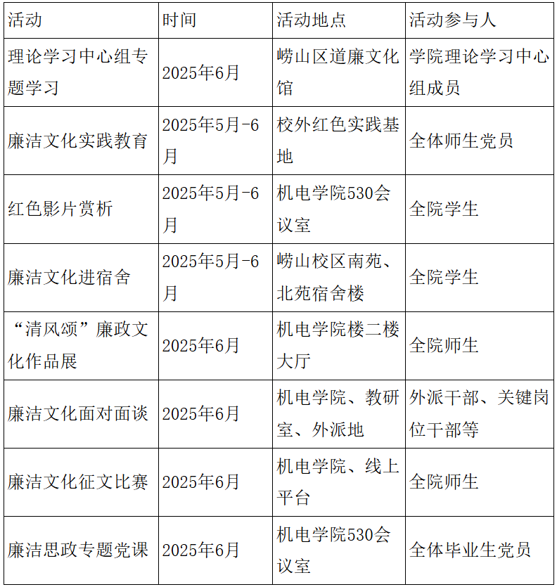 (三)及时凝练总结,加强宣传引导。院内各单位应及时总结,凝练特色亮点,充分利用校园网、“青科机电发布”微信公众号等多媒体平台,切实增强廉洁文化在网络空间的辐射力和影响力,共同营造浓厚的廉洁文化建设氛围。