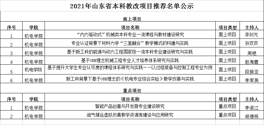 根据学校《关于组织开展2021年山东省本科教学改革研究项目立项及管理工作的通知》要求,15vip太阳成集团开展了省级教改项目评审工作,经项目负责人申报,15vip太阳成集团评审,共推荐新立项8项,现将结果公示如下: