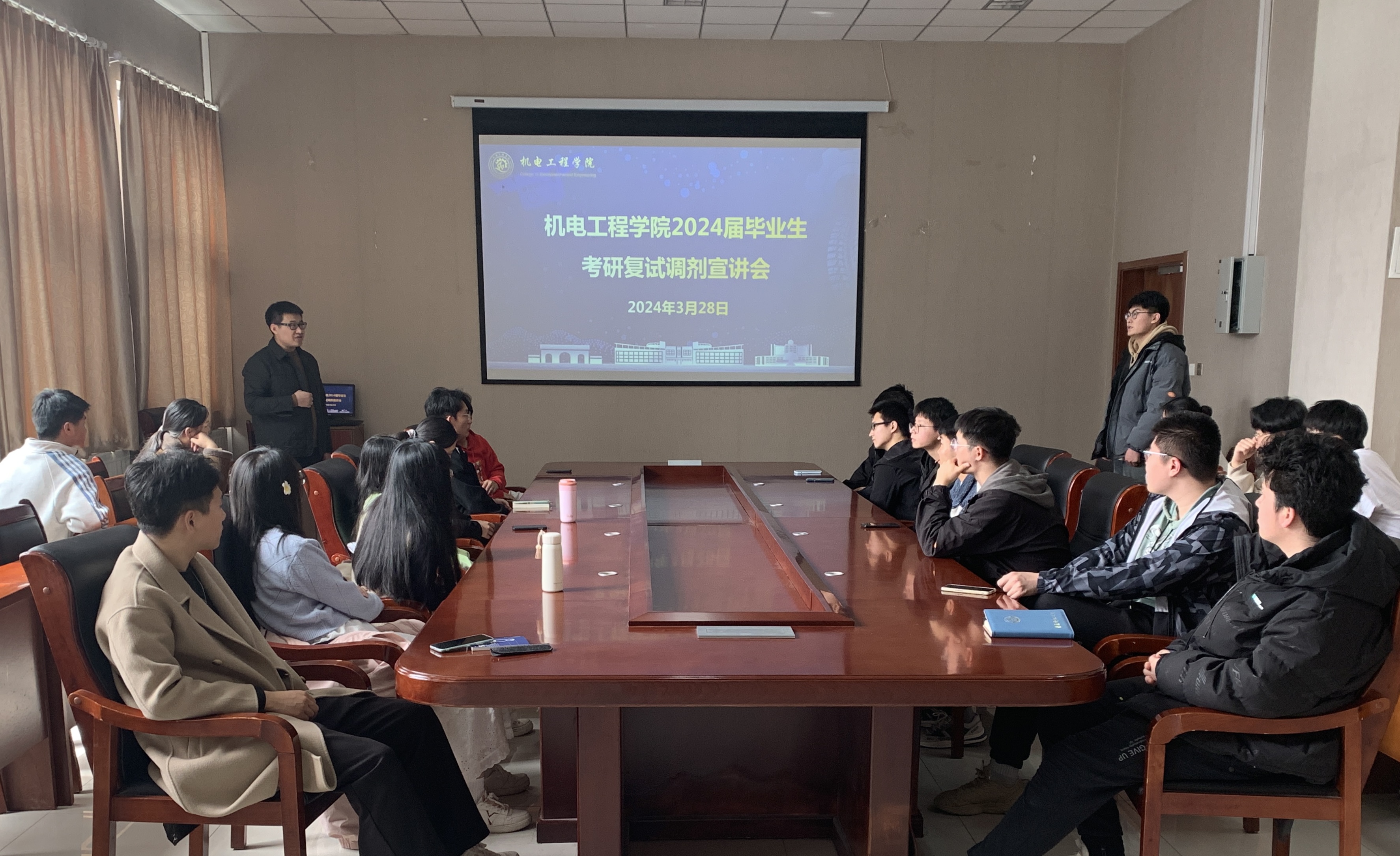 3月28日,15vip太阳成集团2024届毕业生考研复试调剂宣讲会在机电楼518会议室举办。副院长刘治明参加会议并进行复试调剂指导,毕业班辅导员、2024届考研员工代表参加宣讲会。