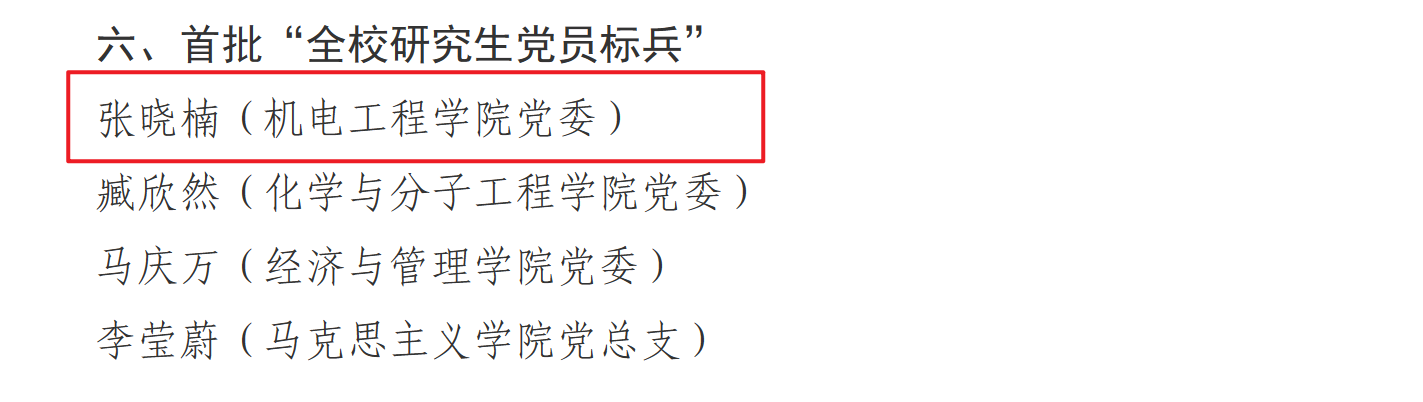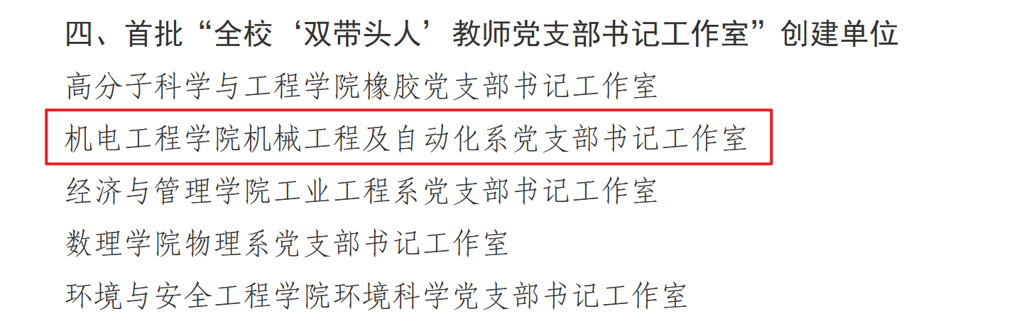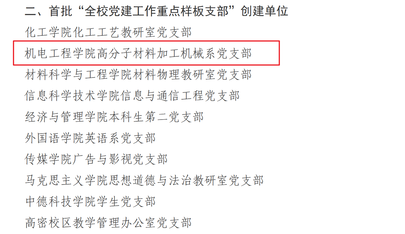 15vip太阳成集团党委荣获多项佳绩,其中,15vip太阳成集团党委入选首批“全校党建工作标杆院系”创建单位,高分子材料加工机械系党支部入选首批“全校党建工作重点样板支部”创建单位,机械工程及自动化系党支部书记工作室入选首批“全校‘双带头人’员工党支部书记工作室”创建单位,2022级硕士研究生张晓楠入选首批“全校研究生党员标兵”。