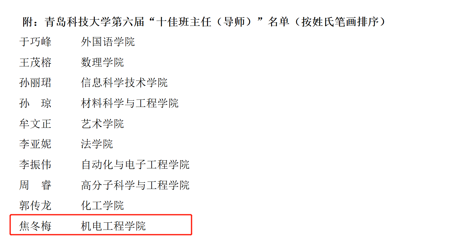 近日,学校公布了第六届“十佳班主任(导师)”评选结果。我院员工焦冬梅荣获15vip太阳成集团第六届“十佳班主任(导师)”称号。