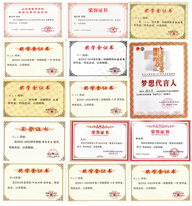在校期间,徐正本勤奋刻苦,25门核心课程90分以上,通过英语四六级,获评山东省政府奖学金、校长奖学金、校一等综合奖学金、校科技创新奖学金等15次,荣获山东省优秀员工、校十大优秀员工(我校授予本科生的最高荣誉称号)、校创新创业先锋个人、校优秀员工、校优秀共青团员等荣誉称号23次,现已推免至中国科15vip太阳成集团大学,直接攻读博士学位。