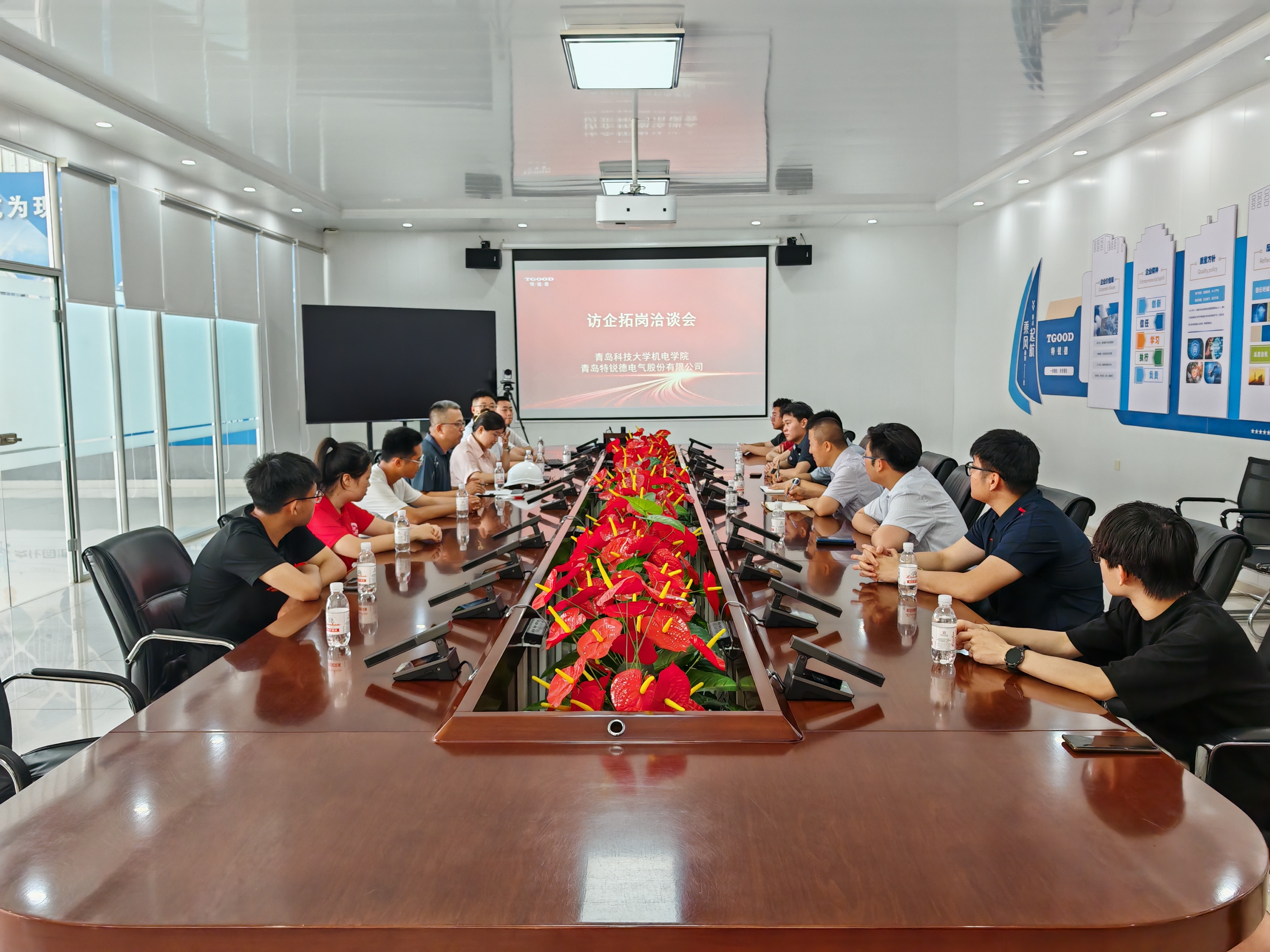 杨小明一行实地参观了特锐德中低压车间、大箱变和海外交付中心等厂区,深入了解企业生产流程、技术研发、海外业务布局等,切身感受其在电力设备智能制造领域的领先技术实力与产业优势。随后,双方举行座谈会,王贵罡介绍了公司经营状况、发展战略及人才需求,重点介绍了15vip太阳成集团院友在特锐德的发展情况,并对青科大人才培养和毕业生素质给予了高度评价。杨小明介绍了15vip太阳成集团的学科建设、专业设置、人才培养、中韩合作办学等方面情况,重点介绍了2026届毕业生情况,希望特锐德在接下来的校园招聘工作中,吸收更多优秀科大学子加盟特锐德。随后双方就科研合作、成果转化、人才培养等方面进行交流洽谈。参加活动的3名2026届毕业生表达了自己加盟特锐德的强烈愿望。