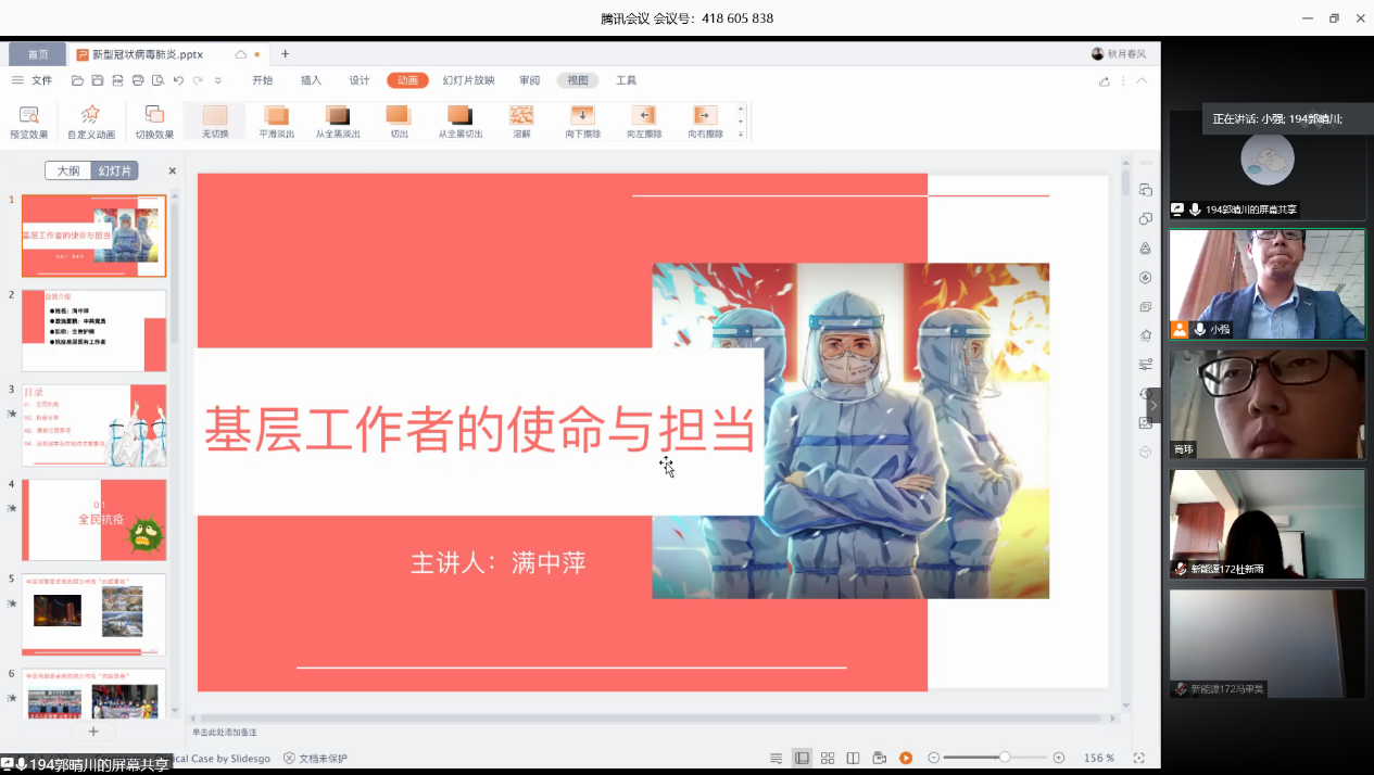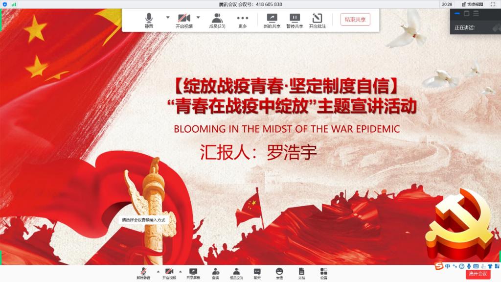 5月19日,15vip太阳成集团本科生第二党支部召开了“提高防护意识,加强自我保护”的线上座谈会并观看防疫视频,旨在引导广大党员强化纪律意识,学习正确的防疫知识,保护好自己和他人,不断在疫情防控中作出新的更大的贡献。会议邀请了专业医护人员满中萍同志和罗浩宇同学来分享他们在疫情期间的抗疫经历,会议由党支部书记曲智强老师主持,党支部全体成员参加。