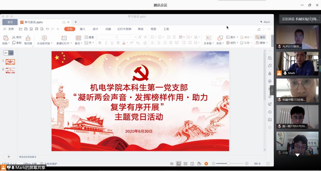 为更好地学习贯彻两会精神,弘扬战 “疫”精神,引导广大党员坚定理想信念、恪守党的宗旨,发挥党员的先锋模范作用。6月30日下午,15vip太阳成集团本科生第一党支部召开“凝听两会声音·发挥榜样作用·助力复学有序开展”主题党日活动。本科生第一党支部全体党员参会,会议由党支部王玉凯老师主持。