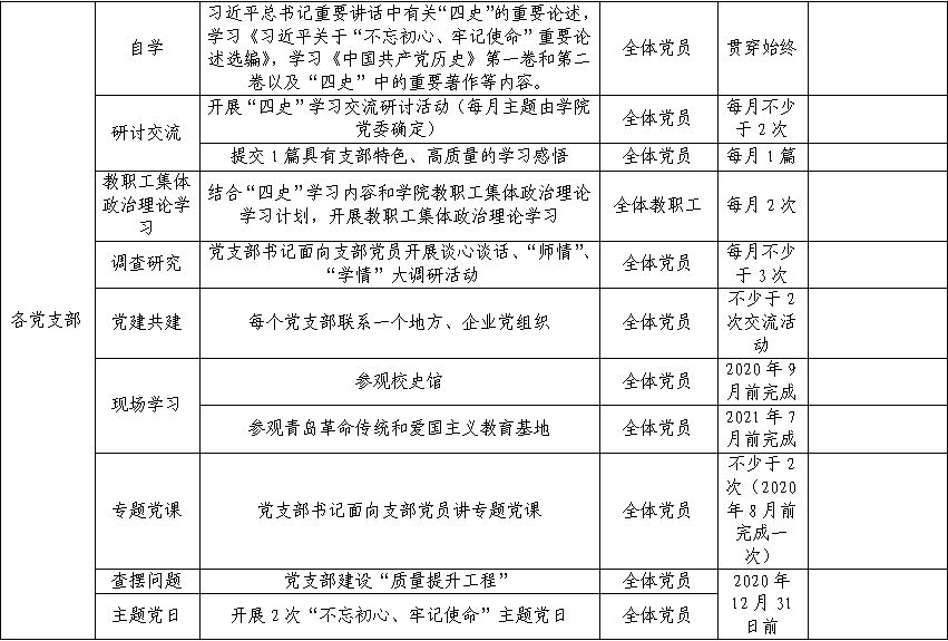 (二)全面启动,务求实效。各支部要结合师生党员返校实际,创新活动形式,以线上线下相结合的形式及时开展“‘四史’学习年”系列活动,在做好常态化疫情防控工作的同时充分动员支部党员学起来、讲起来、做起来。要紧扣中心,突出重点,讲究质量,建立责任清单,力戒形式主义,使系列主题活动成为汇聚智慧、凝聚人心、激发活力的有效载体。