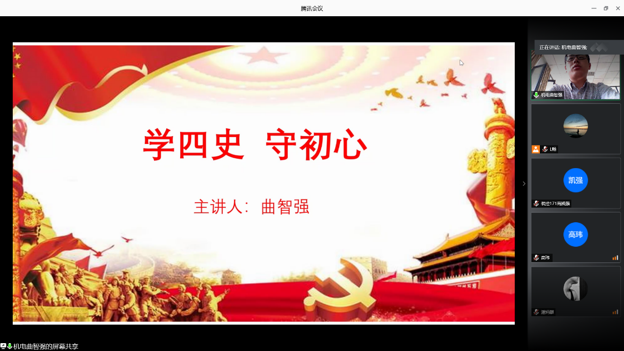 党支部书记曲智强以“学四史,守初心”为主题为全体党员上党课,要求党员同志要从历史汲取力量,保持锐意进取的精神状态,同时找差距,正视差距,永葆共产党人的初心。全体党员同志要认真学习四史,强调中国共产党的历史是一部实践史,也只有共产党才能救中国。以人生选择和学习强国积分为例,指出对于员工党员要有大格局,同时列举表率,树立榜样。