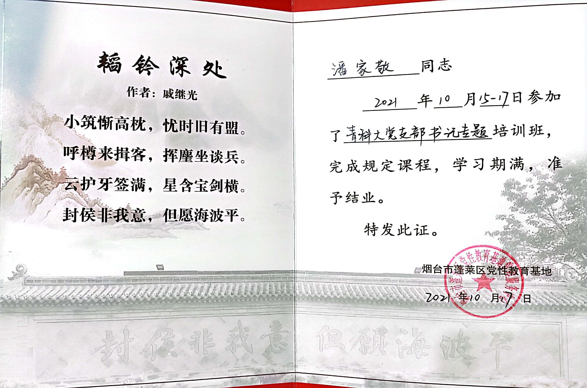材料成型及控制工程教研室党员员工始终坚持把“立德树人”作为教育的根本任务,积极开展课程思政,并与党建有机结合。全体党员勤奋刻苦、真抓实干、锐意进取,潜心育人,发挥了很好的模范带头作用和战斗堡垒作用。在学校的组织下,党员员工潘家敬赴烟台蓬莱党性教育基地进行了青科大党支部书记专题培训,并顺利结业。