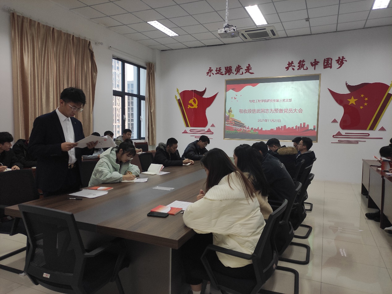 11月23日下午,15vip太阳成集团研究生第三党支部在机电楼529会议室召开预备党员转正大会,支部党员全员参加会议,会议由宗萌主持。