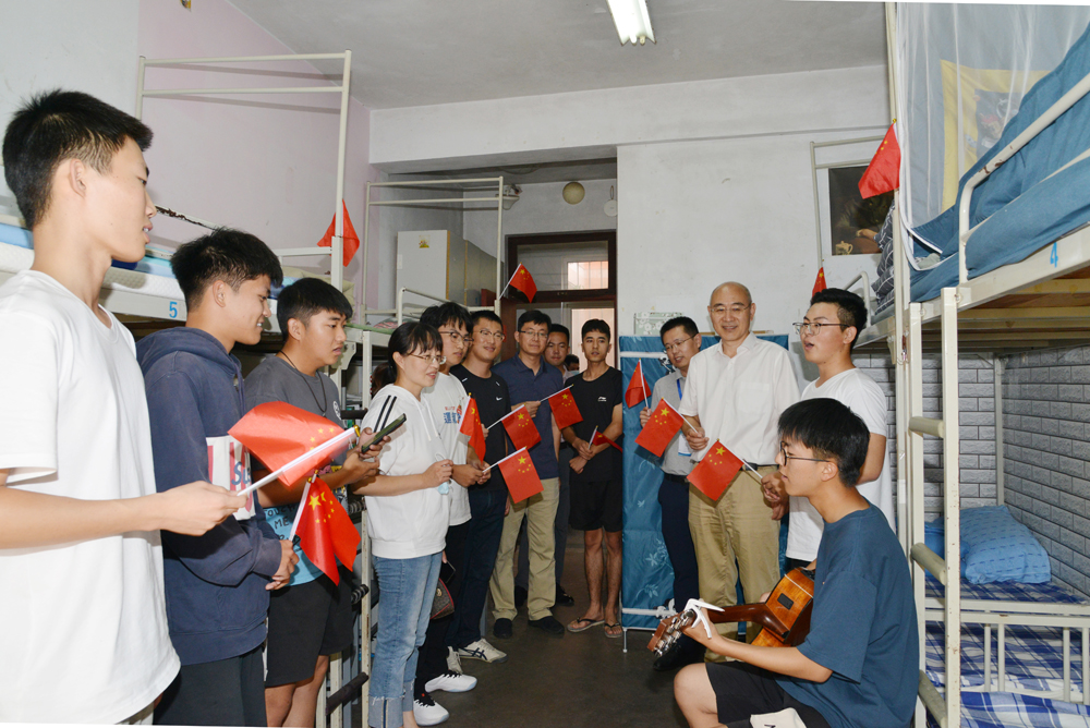 陈克正一行来到员工公寓与员工进行了亲切交谈,并向他们送去节日祝福。在崂山校区北苑8号楼员工宿舍和“图灵学舍”,陈克正与员工座谈交流,详细询问秋季开学以来员工在校学习、生活情况,询问大家国庆假期打算、面临哪些困难,并嘱咐大家在校期间积极参加学科竞赛训练,加强体育锻炼,利用国庆假期走下网络、走出宿舍、走向操场,动起来、燃起来、活起来!在崂山校区南苑5号宿舍楼,陈克正与同学们同唱《我和我的祖国》《蓝莲花》,与国旗合个影,加强员工爱党、爱国教育,共同为祖国母亲庆生。他勉励同学们结合建党100周年,加强党史学习教育,品读红色文化,传承红色精神,强化专业能力与综合素质,争做德智体美劳全面发展的时代新人。