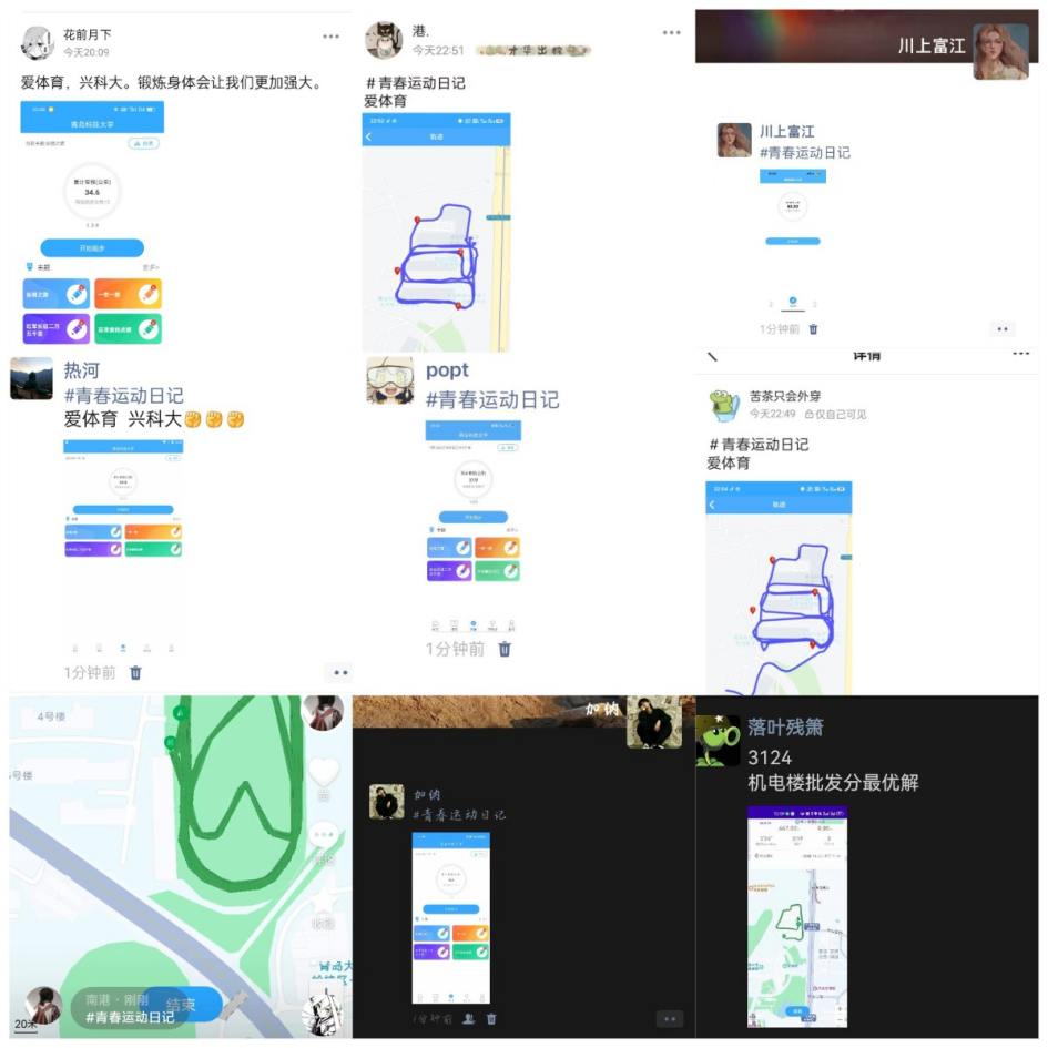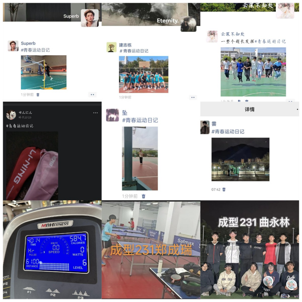 同学们打卡形式丰富多彩:球类、俯卧撑、仰卧起坐、跑步、健身等。此外,员工在社交软件发布视频照片,针对现阶段体育热门话题进行讨论分享,掀起青春运动的热潮。
