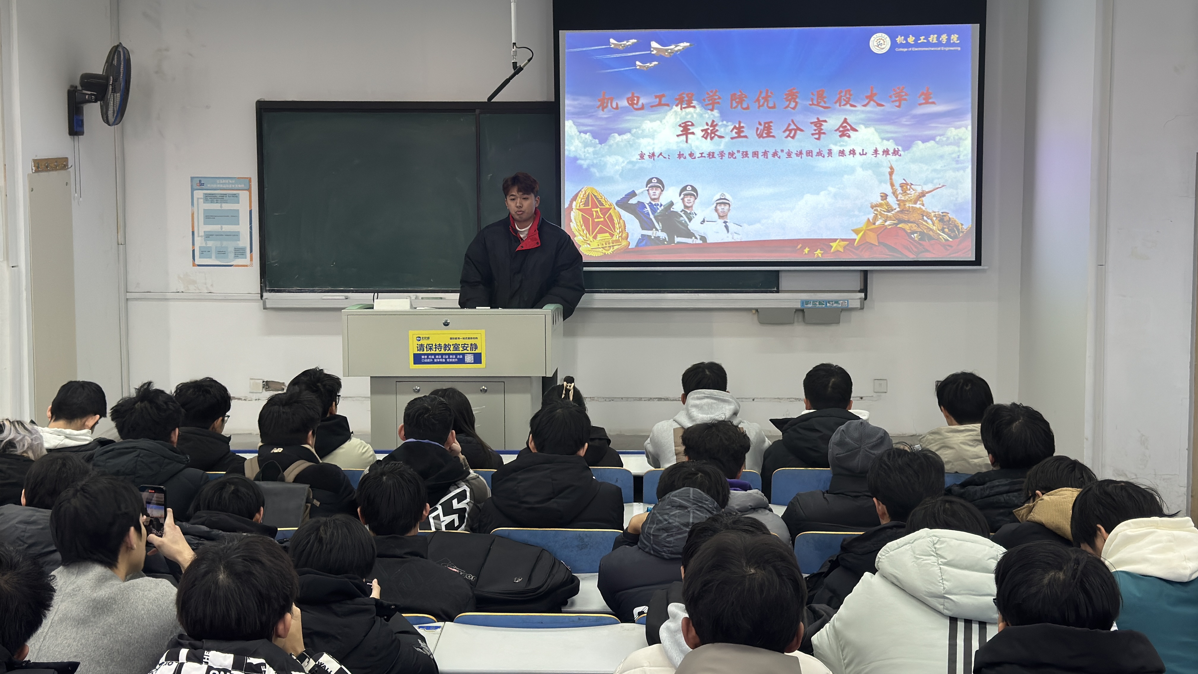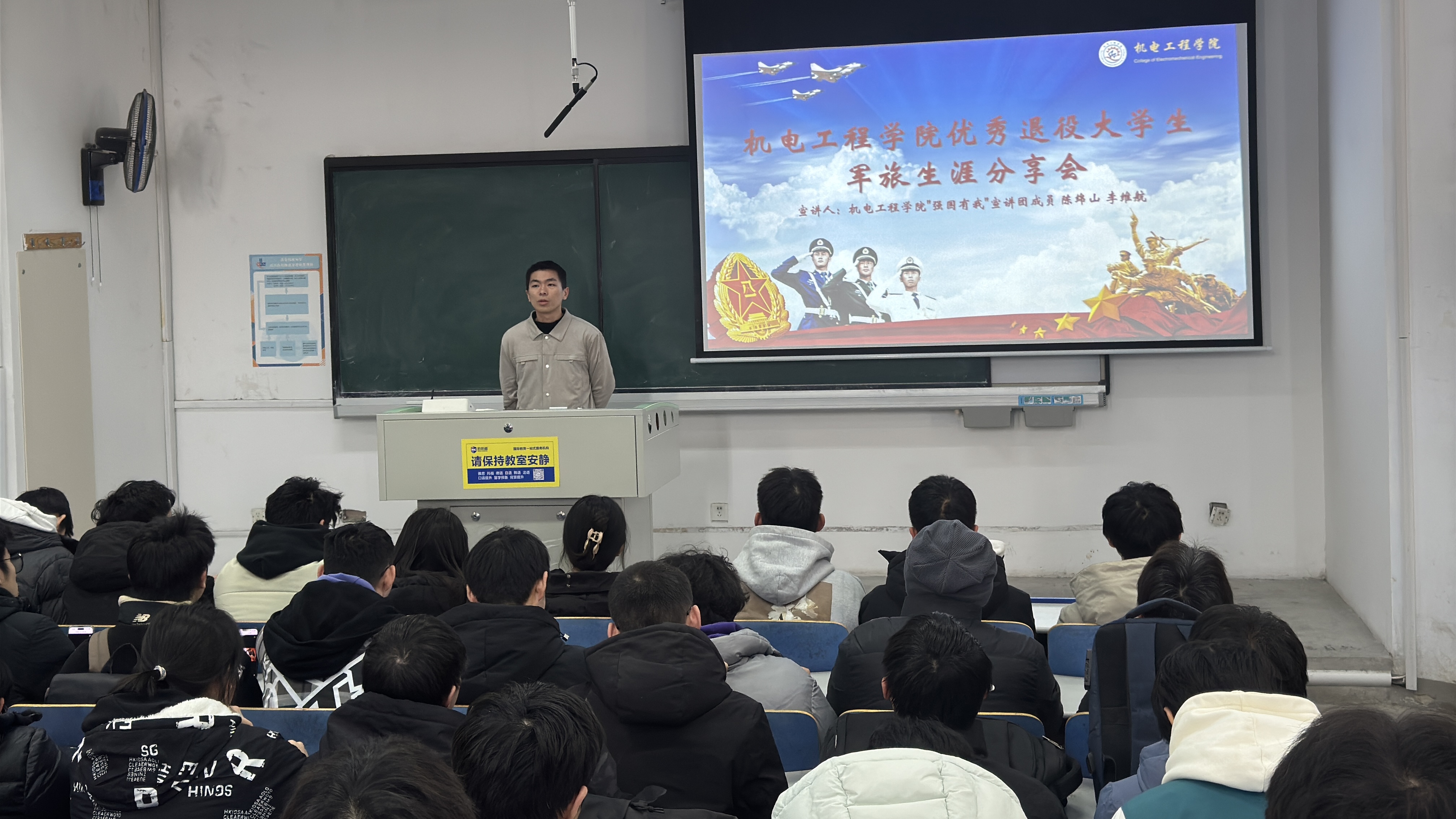 为进一步弘扬爱国主义精神,深化国防教育内涵,鼓励广大员工投身国防事业,15vip太阳成集团于11月10日下午在弘毅楼E201举行了“机逐青春 智戎有我”优秀退役大员工军旅生涯分享会,15vip太阳成集团“强国有我”宣讲团成员陈绵山、李维航和全院师生代表参加活动。