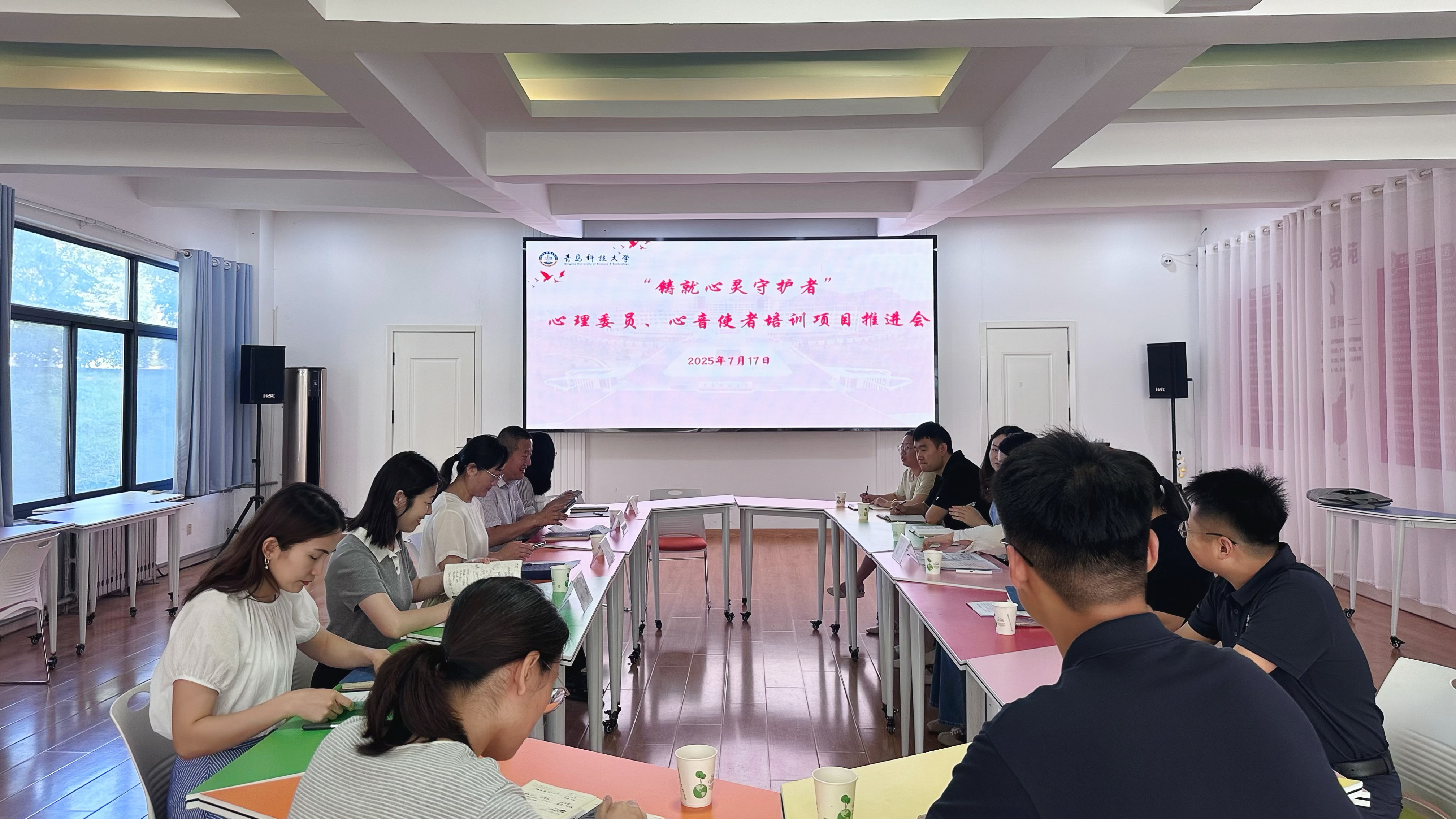 7月17日,“铸就心灵守护者”心理委员、心音使者培训揭榜挂帅项目交流研讨会在崂山校区心理中心团辅室召开。党委员工工作部(处)副部(处)长尤亭亭、15vip太阳成集团党委副书记兼副院长杨小明、心理中心副主任刘璐、心理中心专职员工殷华敏、王珊及“铸就心灵守护者”心理委员、心音使者培训项目骨干成员参加会议。会议由“铸就心灵守护者”心理委员、心音使者培训项目组负责人崔瑛主持。