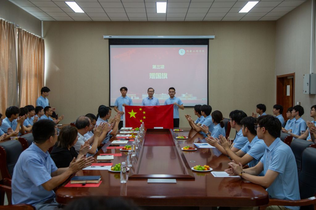 会上,任允晓为留员工代表赠予国旗,与会领导为全体赴韩同学颁发“动力礼包”,出国留员工代表杨桐发言,表达了赴韩留学的初心使命、铿锵誓言。