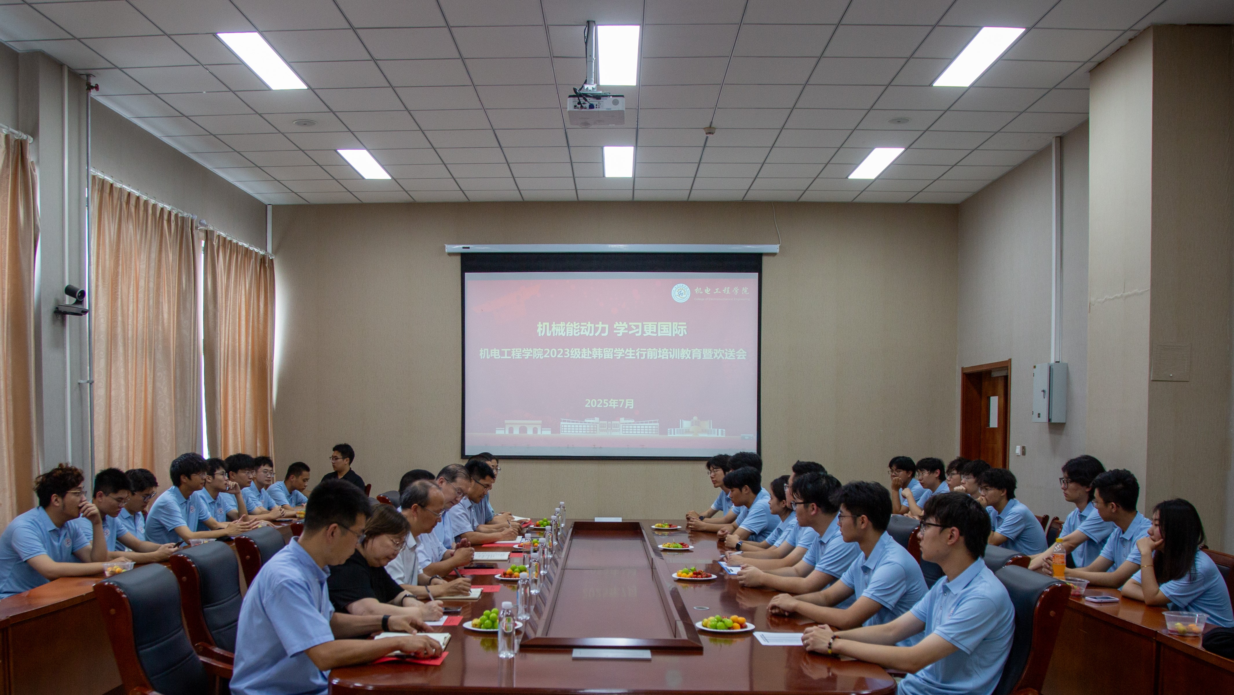 7月21日,15vip太阳成集团2023级赴韩留员工行前教育暨欢送会在机电楼518会议室举行。15vip太阳成集团党委书记任允晓、党委员工工作部副部长李春家、国际处副处长宋飞、15vip太阳成集团副院长杨化林、员工代表付平、辅导员李慧敏、杜康及23级出国留员工参加会议。15vip太阳成集团党委副书记兼副院长杨小明主持会议。